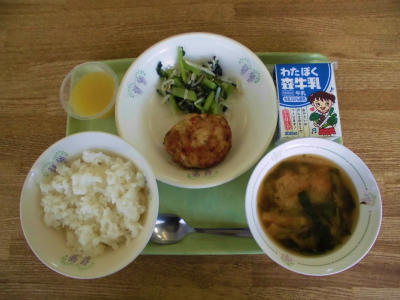 ごはん 牛乳 大豆ハンバーグ 青菜ともやしのソテー みそ汁 オレンジゼリー