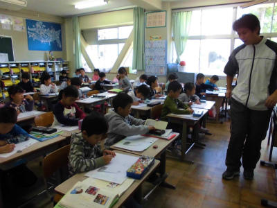 1年生も英語活動 カードを使って動物の名前に親しみながらゲームをしています。
