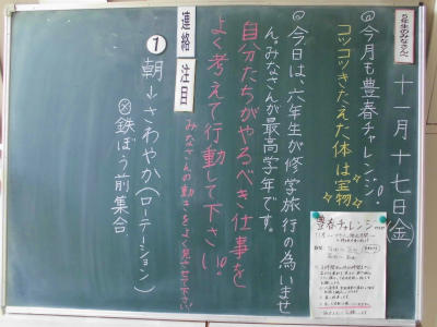 豊春小学校では、11月14日県民の日、15日土曜参観日の振替休業日と週半ばの2連休となります。子どもたちが安全に過ごせるよう、保護者の皆様、地域の皆様、見守りをお願いいたします。子どもたちには、自分の安全を自分で守るよう、学校等で学んだことを活かしてほしいと願っています。