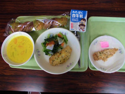 スティックチョコパン 牛乳 白身魚の香味焼き かぶのサラダ かぼちゃのポタージュ