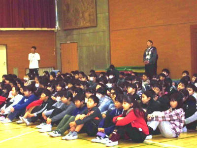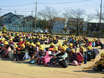 交通安全の決まりの確認、通学班登校の際の約束を確認をするために、全校児童が校庭に集まりました。静かに集合し、落ち着いた態度で話を聴ける子どもたちです。地域の人や友だちや家の人へのあいさつも進んで行うよう、話しました。