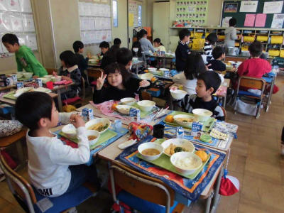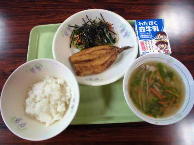 ごはん、牛乳、いわしのかば焼き、磯香和え、みぞれ汁