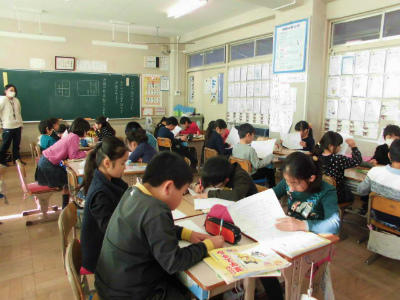 書きぞめの練習のために登校した子どもたちの様子です。一生懸命です。休憩を取りながら、2時間集中して書きます。