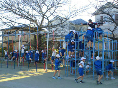 4年生 のぼり棒とジャングルジム。冷たい鉄棒を触り、かじかむ手をこすりながら頑張ります。
