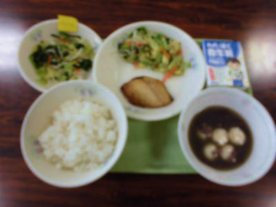 ごはん、さばの幽庵焼き、千草炒め、おしるこ