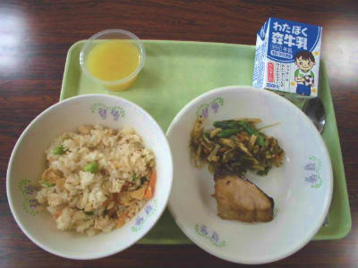 五目炊き込みごはん、牛乳、いかの竜田揚げ、小松菜のおひたし、みそ汁