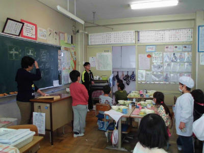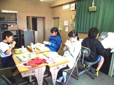 5年生の教室の様子と、昼も給食をいただきながら放送委員の仕事をする高学年の子どもたちの様子です。