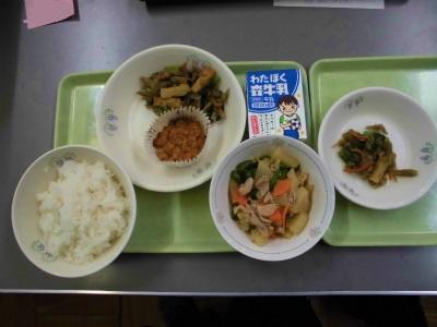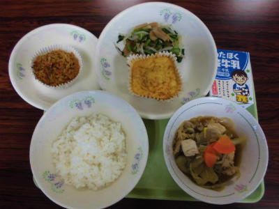 ごはん、牛乳、切り干し大根入り卵焼き、小松菜とメンマのソテー、すきやき風煮