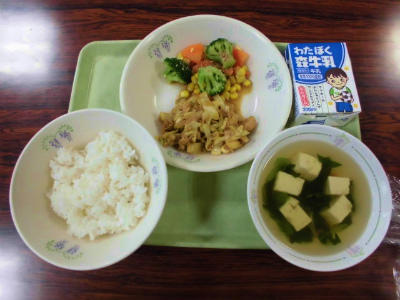 ごはん、牛乳、鶏ちゃん、ブロッコリーのごま醤油和え、お吸い物