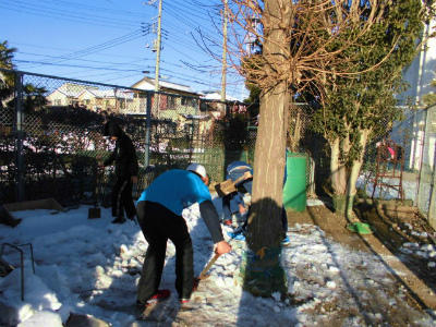 校庭に出るまでの通路の氷を寄せています。早く校庭で遊びたい子どもたちです。