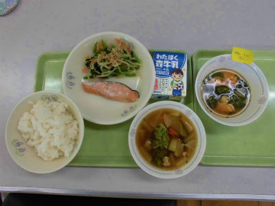 ごはん 牛乳 鮭の塩焼き たくあん和え 二色すいとん