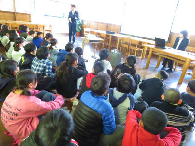 ボランティア委員会児童が、書き損じ葉書などを集める呼びかけを1年生のクラスで行っているところです。