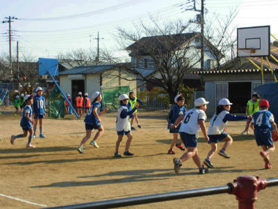 暖かくなってきた外で、バスケットボールの試合です。元気に声を掛け合ってゲームをしています。