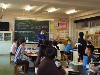 理科の実験 ビーカーにおがくず等を入れて、水を温めるとどのような動きが起こるのか、観察しました。