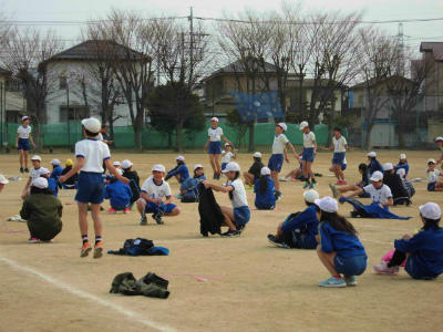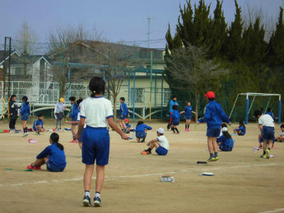 高学年の中には、長い時間跳び続けることができる子ども、いろいろな技ができる子どもがいます。見学の子どもも、跳べた回数を数えるなどして参加しています。