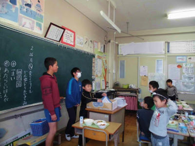 きょうの献立が全部揃ったか、給食当番が確認しています。