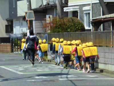 右側2列に並んで下校します。通学路途中や決められた場所でおうちの方が迎えてくださるので安心です。