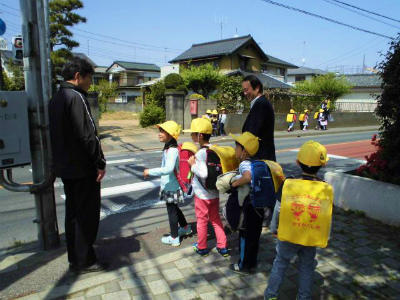 豊春小近くの押しボタン信号で、先生方にあいさつをしています。学校生活に慣れてきている様子に安心します。