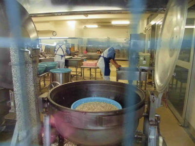 朝の給食室の様子です。調理員さんたちが野菜を刻んでいます。