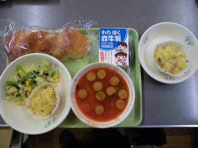 ツイストパン 牛乳 ポテトのチーズ焼き アスパラサラダ ミネストローネ