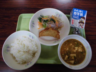 ごはん、牛乳、手作り餃子、中華サラダ、マーボー豆腐