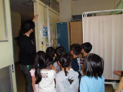 担任の先生と校舎内巡りをしているところです。幼稚園や保育園のときにも来たことを覚えている1年生です。保健室の器具を見たり、校長室にある物についてを質問したりしていました。