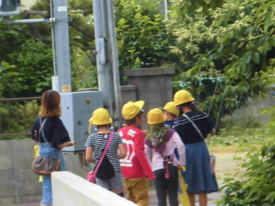 グループでまち探検に出かける子どもたちです。とてもうれしそうです。「行ってきます」のあいさつも、元気にできます。