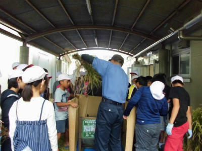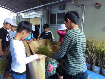 5年生はバケツで育てた稲の脱穀体験をしました。学校応援団の渡辺様には、いつも大変お世話になっています。米の収穫だけでなく、わらは畑を整えるために使います。
