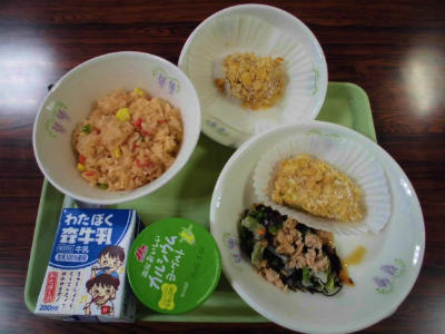 給食の献立です。メキシカンライス、牛乳、チキンのこんがり焼き、磯香和え、ツナとひじきのサラダ、ヨーグルト 除去は卵抜きのこんがり焼き