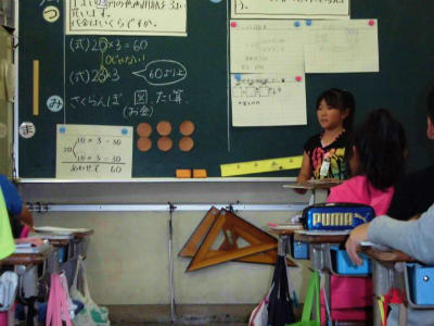 3年生 算数 2ケタ☓1ケタの数の計算を工夫して行います。自分の考えを前に出た発表しています。実習生の先生と学習しました。