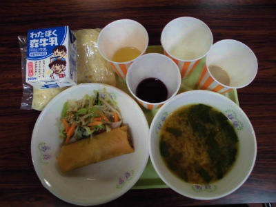 みそラーメン、牛乳、切り干し大根の春巻き、華風和え