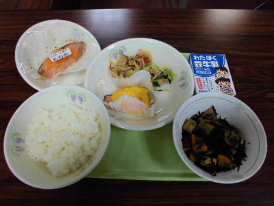 ごはん、牛乳、鮭の黄金焼き、肉野菜のみそ炒め、凍り豆腐の煮物