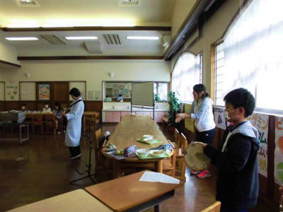 栄養士の先生のギター、高学年児童のリズム伴奏で誕生日の歌をうたいました。