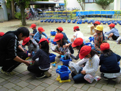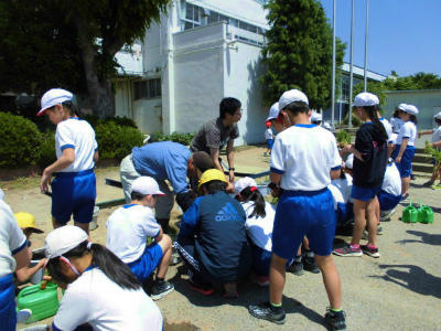 5年生 社会 総合 バケツで稲を育てます。いつも地域の支援者渡辺様が、稲の植え方や育て方を教えてくださいます。お米が食べられることを期待して、育てていきます。
