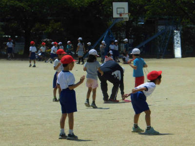 白い帽子が2年生、赤い帽子が1年生、暑くなってきた昼前、校庭で元気に遊びました。