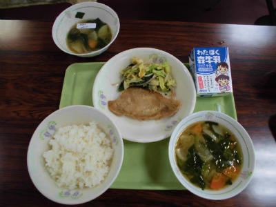 献立は ごはん、牛乳、豚肉の生姜焼き、おかかいため、ごまみそ汁