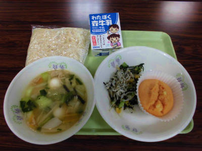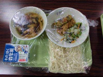 肉うどん、牛乳、竹輪の二色揚げ、青菜とかんぴょうの和え物