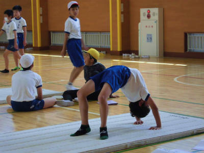 6年生 体育 マット運動 技ができるようになるためのポイントを確かめながら練習し、きれいなブリッジもできました。子ども同士の声の掛け合いも、上達の大事な助けになります。