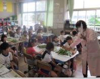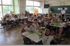 2年生の子どもたちが、栄養士の先生から、そら豆のむき方を教えていただきました。
