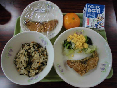 ひじきごはん、牛乳、かつおのごま風味あげ、やまぶき和え、冷凍みかん