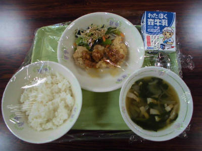 ごはん、牛乳、油淋鶏、小松菜のナムル、春雨スープ