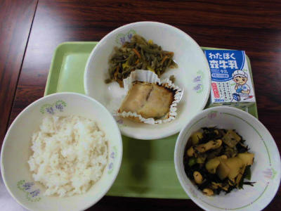 ごはん、牛乳、さわらの西京焼き、カラフルきんぴら、磯煮