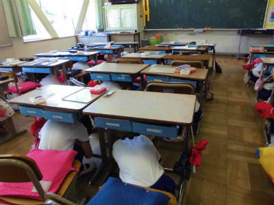 強い地震が実際に起きたときを想定して、机の中に潜り身を守る訓練です。
