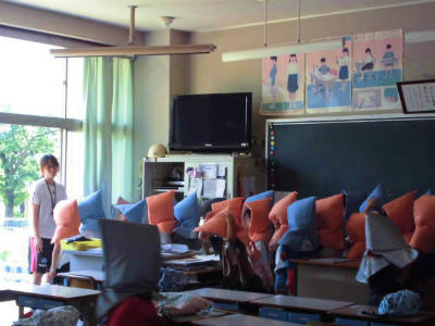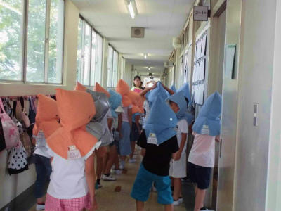机のないイングリッシュルームでは、椅子で頭を守るよう、先生の話を聞いているところです。