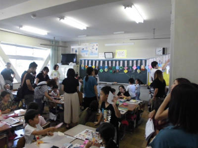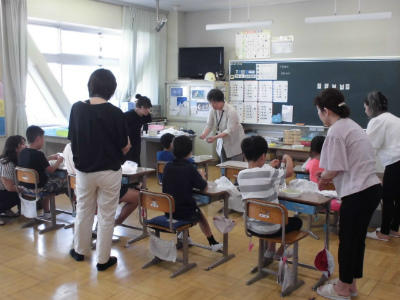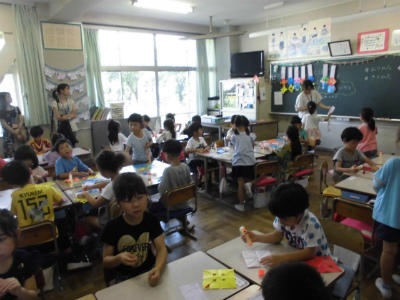 1年2組も図工「ちょっきんぱかざり」です。保護者が子どもの側にいついてアドバイスをしてくれていました。みんなきれいな作品を作れましたね。