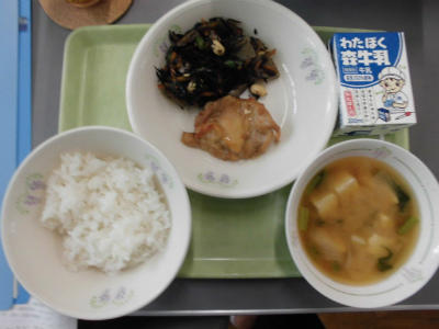 本日の給食は、ごはん、牛乳、鶏肉の照り焼き、ひじきの煮物