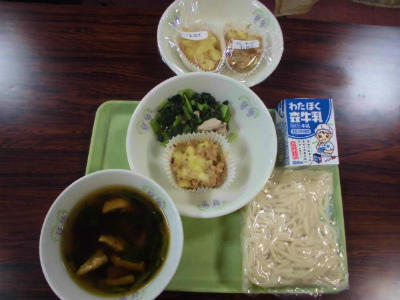 地粉うどん、きつねうどんの汁、牛乳、ツナとポテトの香り焼き、青菜と豚肉の炒め物