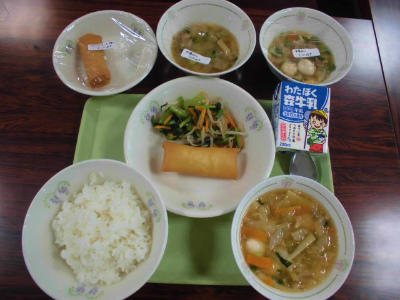 本日の給食は、ごはん、牛乳、とり肉の唐揚げ、卯の花の炒り煮、沢煮椀でした。