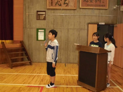 力を合わせ、会を運営した計画委員の児童です。まとまりのあるよい会でした。友だちタイムのときに行ったクイズの正解発表も、昼の放送で全校児童が楽しく聞くことができました。