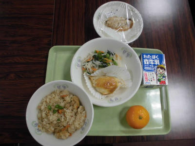 本日の給食は、こぎつねごはん、牛乳、さばの味噌マヨネーズ焼き、切り干し大根の和え物、冷凍みかんでした。